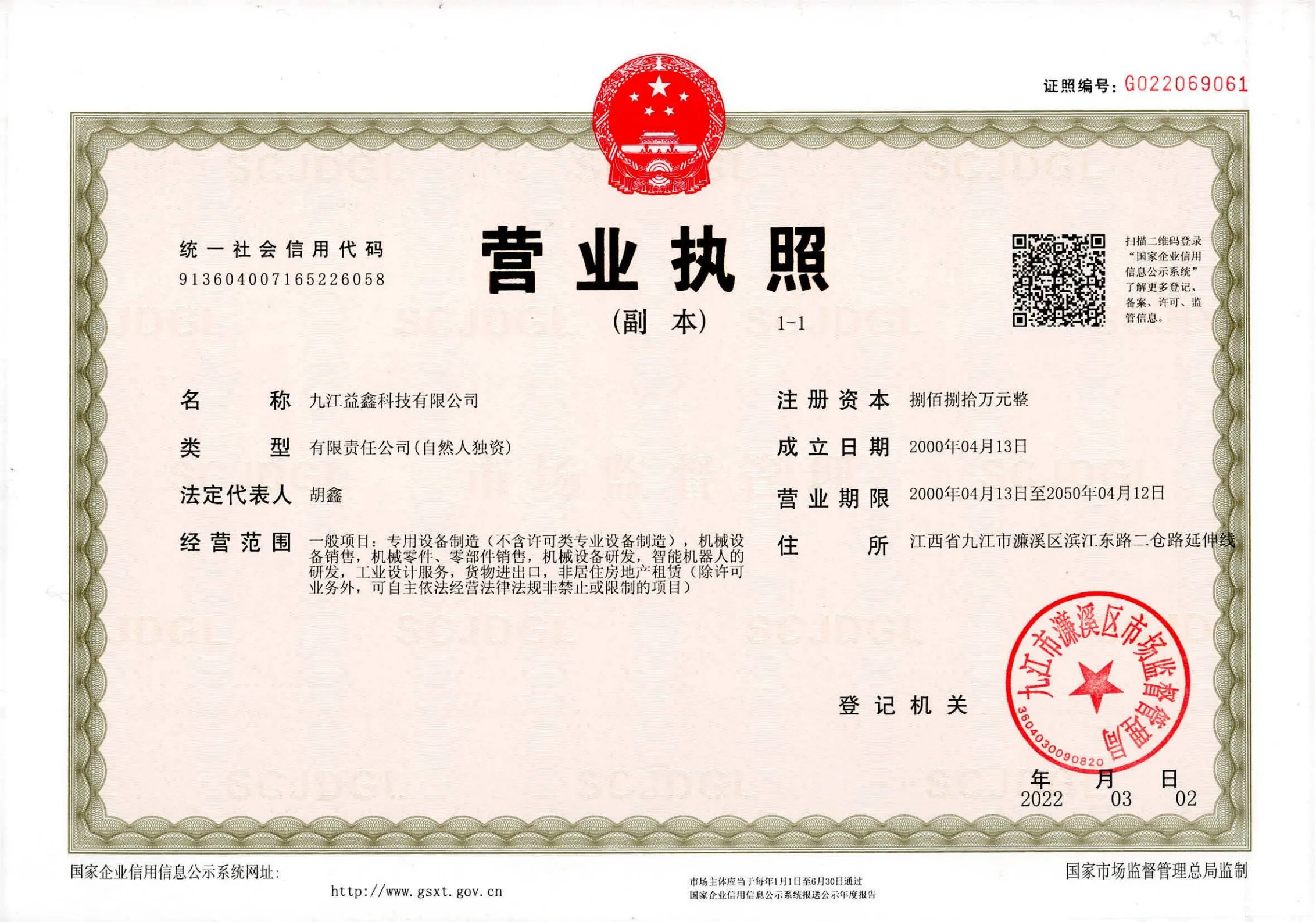 Registered address : Extension Line Of Ercang Road, Binjiang East Road Jiujiang Jiangxi China